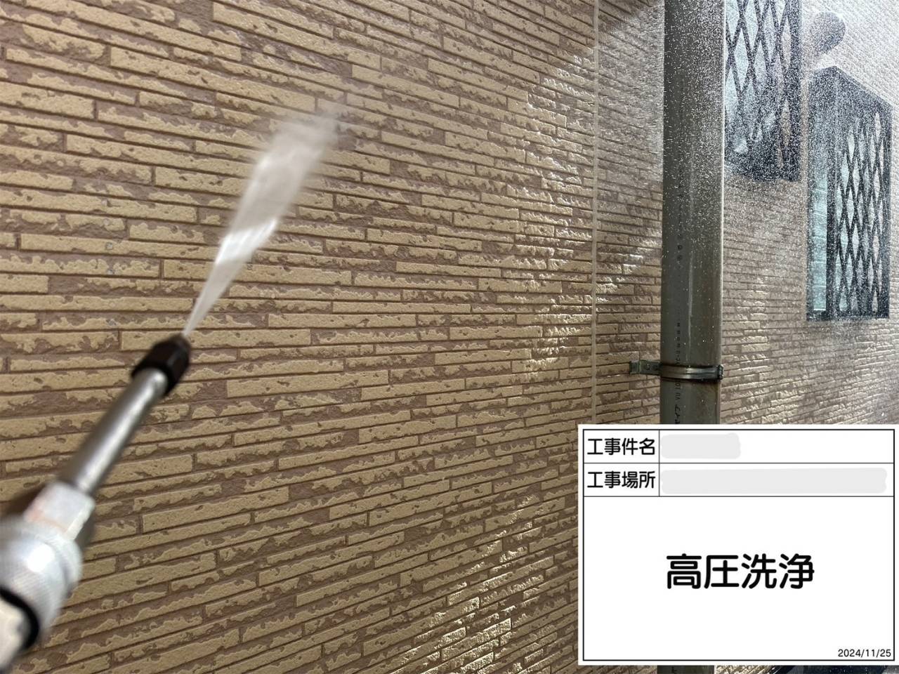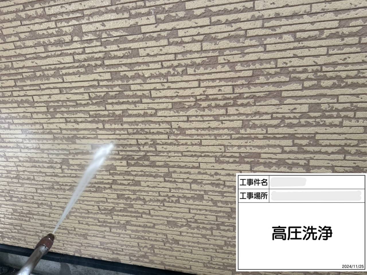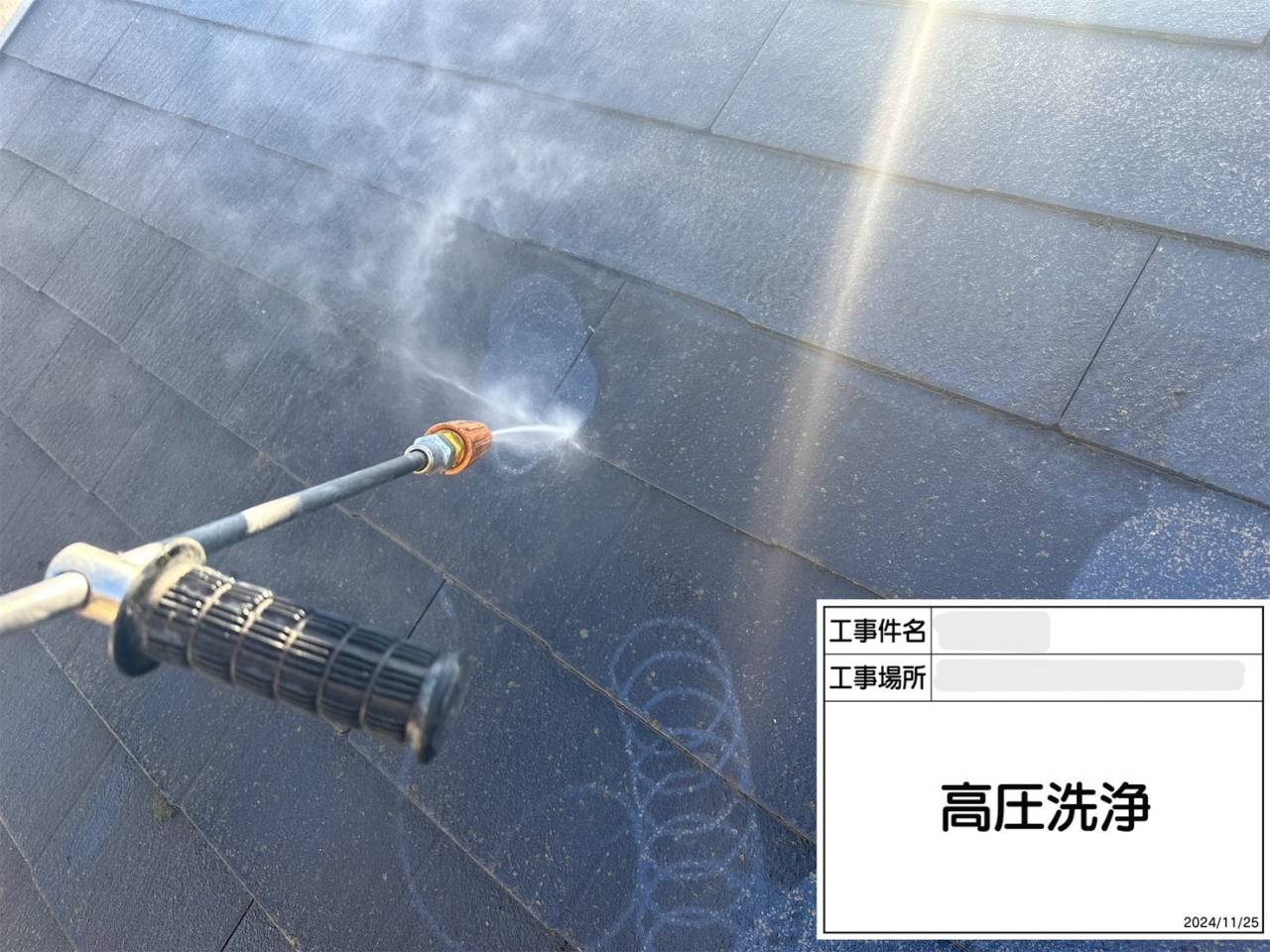 まずは安全性と作業効率を確保するために、仮設足場を組み立て、飛散防止用のメッシュシートを設置。その後、高圧洗浄機にて屋根・外壁・付帯部にこびりついた汚れやカビ、古い塗膜の浮きなどを丁寧に洗い落としました。