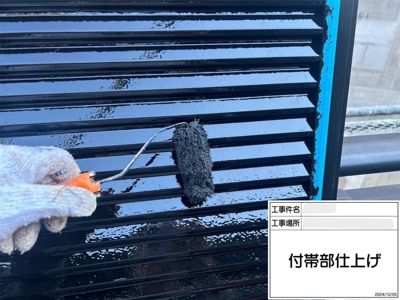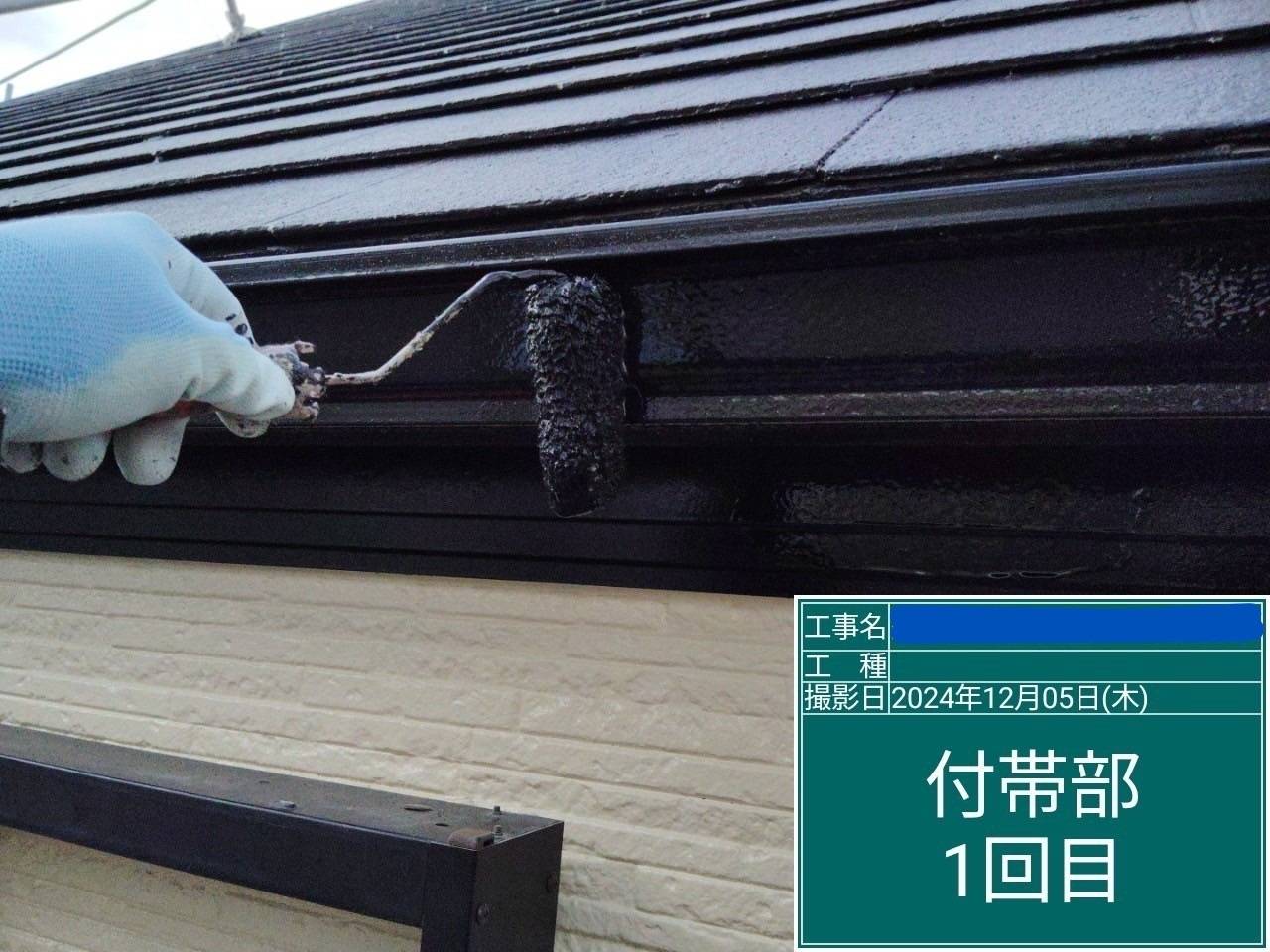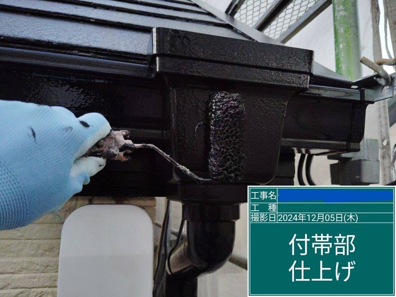 特に破風や雨樋には、色あせやコケの付着が目立っていたため、丁寧に下地調整を行い、艶のあるブラック系で美しく塗り直しました。