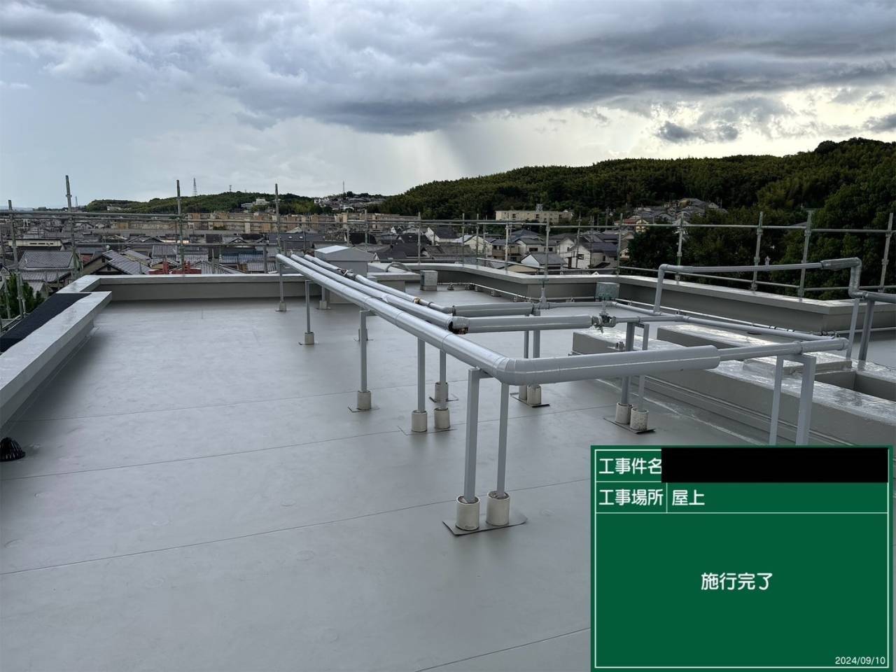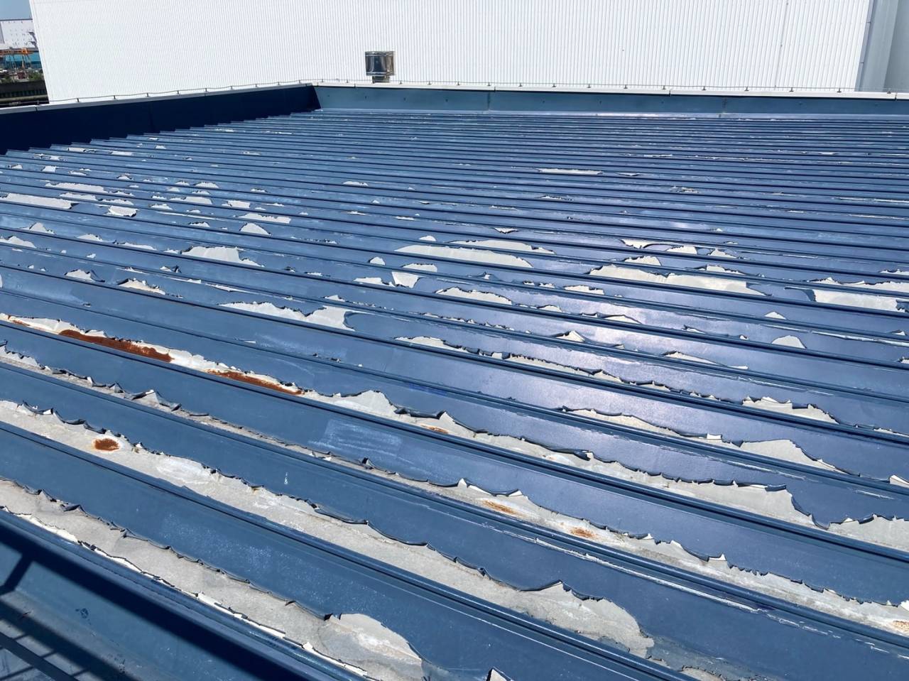 今回の施工では、折半屋根の塗装と陸屋根の防水工事を行い、