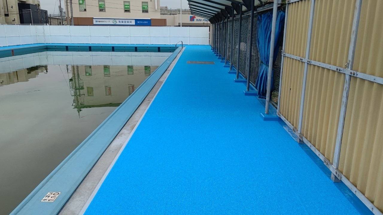 プールサイドに防滑シートを張る工事で、先に外側で露出している部分にウレタン防水を塗布し、