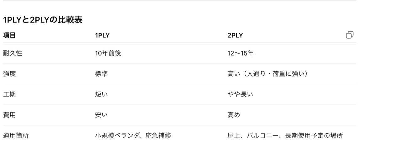 - 1PLY:標準的な強度。歩行頻度が低いバルコニーや小面積に向きます。